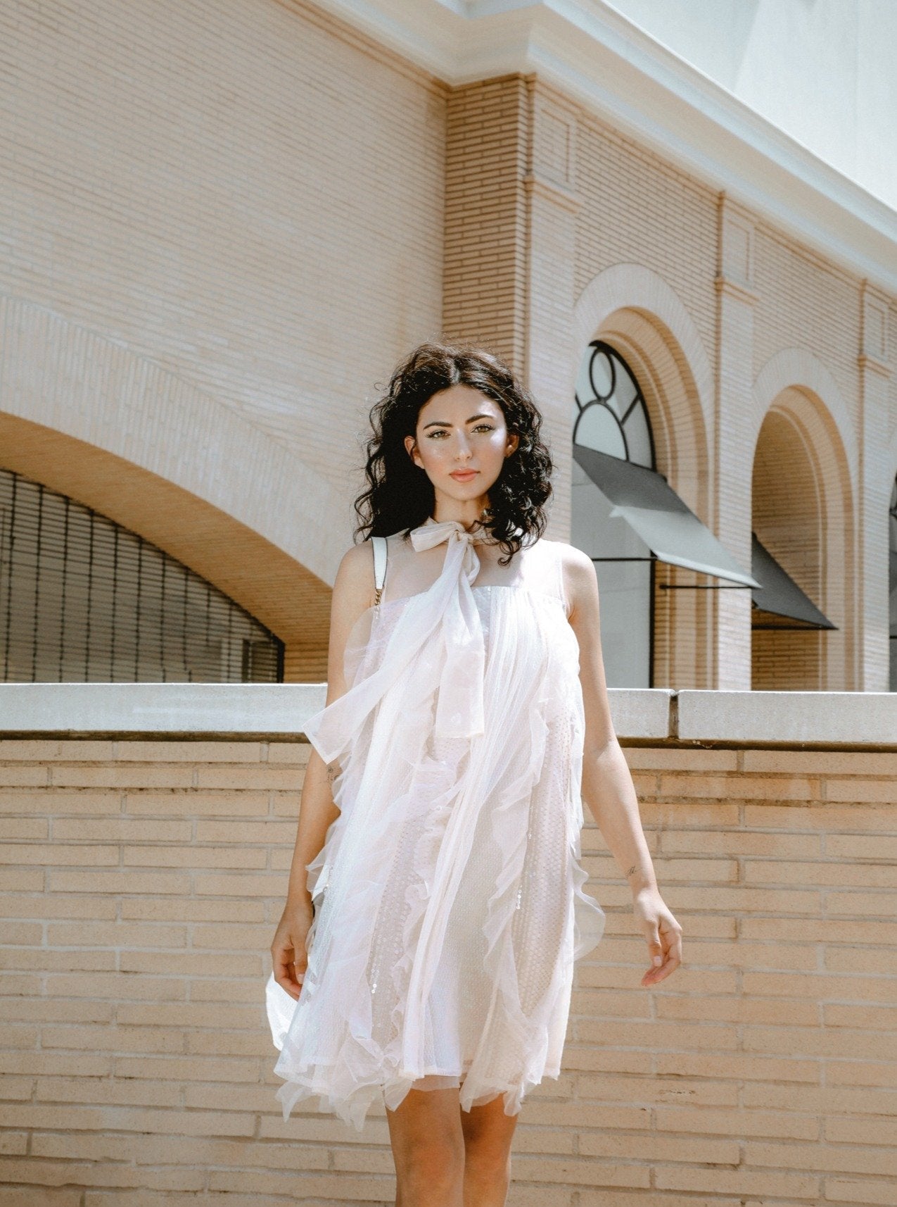 Description: Head-turning and strikingly ethereal, this mini dress effortlessly flutters and floats with every step. Crafted in a lightweight and luxe Champagne hue, this party dress features an illusion neckline with a gorgeous bow tie collar. Soft pleats, gentle ruffles, and subtle touches of sequined sparkle add to its dreamy appeal, making it heaven in a dress.